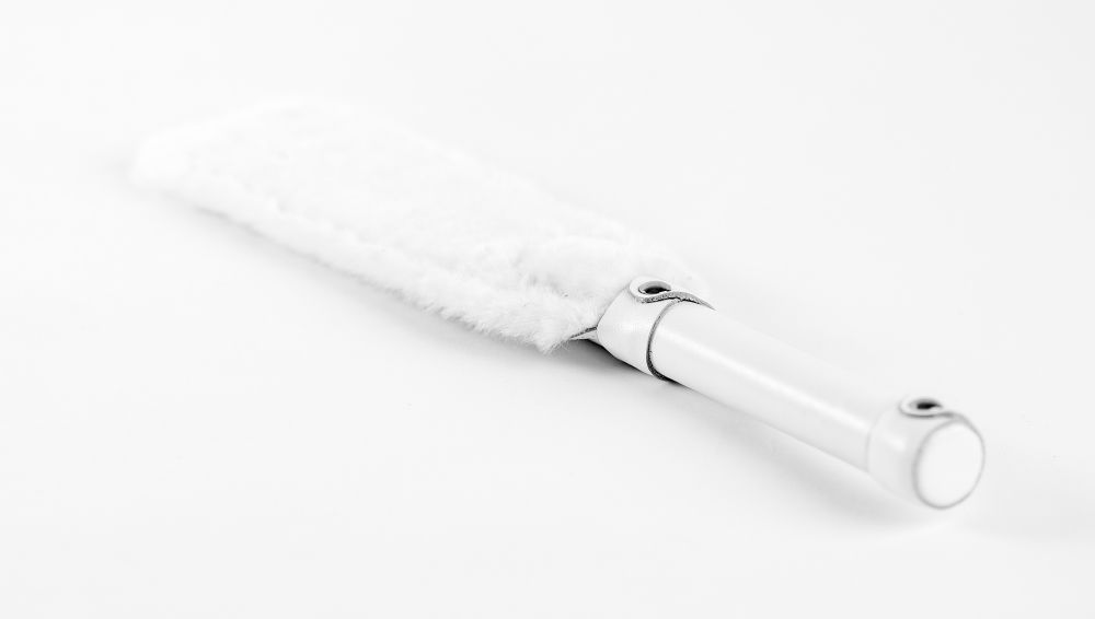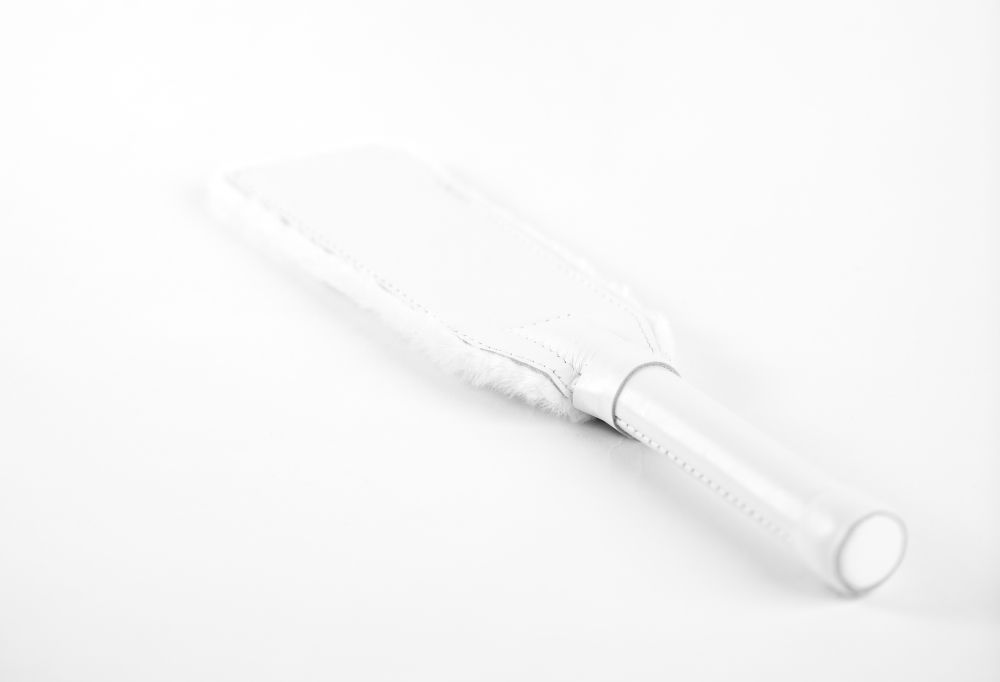 Двусторонняя шлепалка. С одной стороны выполнена из натуральной кожи белого цвета, с другой стороны нежнейший мех. Ручка из натуральной кожи максимально комфортна в руке. Шлепалка при ударе звучит громко и эффектно. Длина ручки — 13 см.