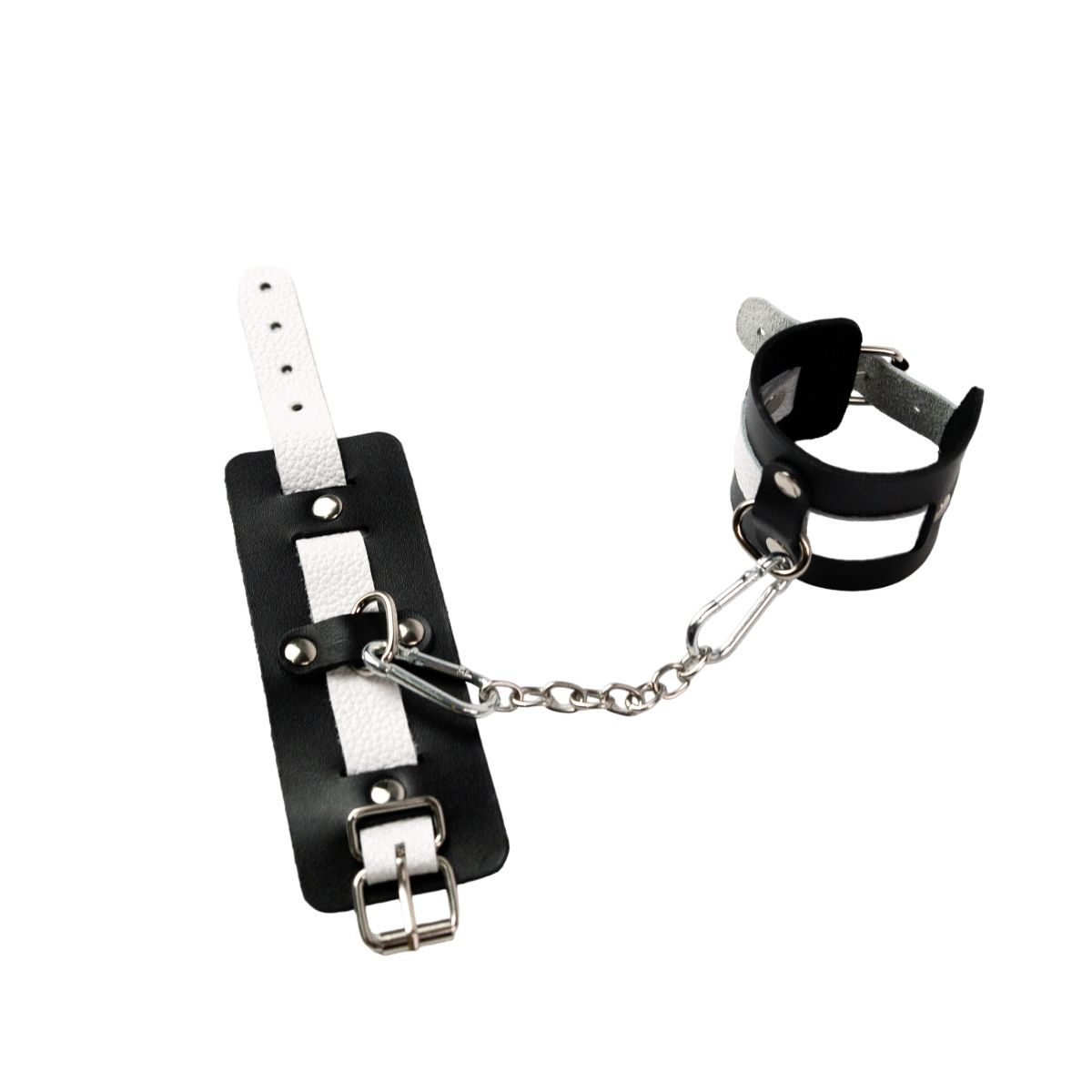Оковы состоят из двух деталей: основа прямоугольной формы из натуральной кожи черного цвета и ремешок белого цвета с прочной хромированной фурнитурой в виде овального кольца. Расположение ремешка через прорези основной части является декоративным решением, а также служит для лучшей регулировки размера. В комплект входит соединительная цепочка с двумя карабинами. Общая длина — 32 см. Длина манжеты — 15,5 см. Ширина манжеты — 6 см. Обхват — 20-29 см.