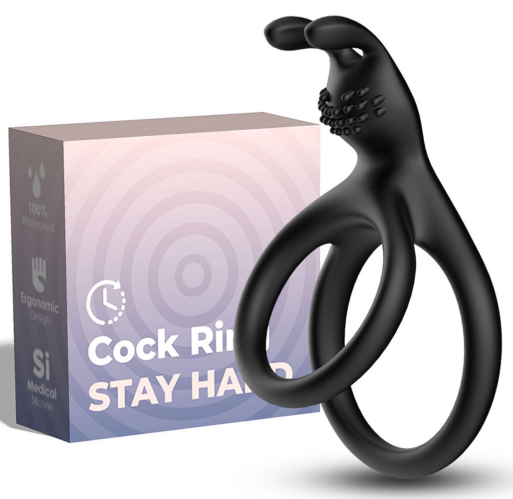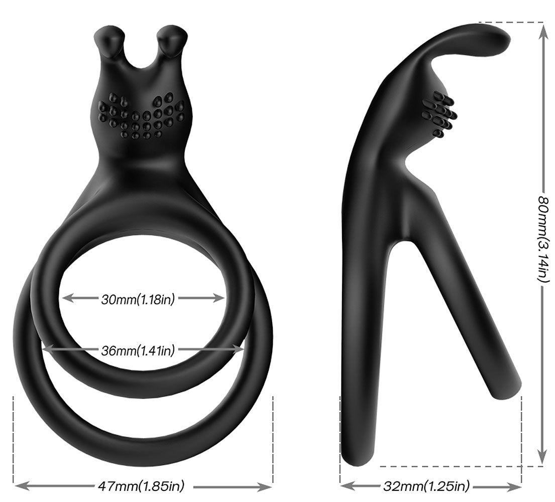 Эрекционное кольцо с дополнительным стимулятором клитора и дополнительным кольцом под мошонку. Внутренний диаметр колец — 3 и 3,6 см.