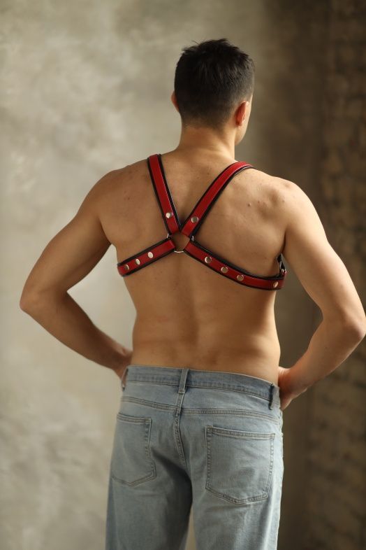 Яркая и стильная, очень качественная мужская портупея, полностью выполненная из натуральной кожи. Лицевая часть выполнена из красной кожи, а подклад — из черной, очень мягкой и приятной к телу. Фиксация происходит с помощью кнопок, что позволяет легко и удобно регулировать посадку аксессуара по фигуре. Портупея декорирована надежными сварными металлическими кольцами, к которым можно при желании пристегивать дополнительные аксессуары и комбинировать в разных вариантах. Портупея двусторонняя: ее можно носить по разному, меняя положение.