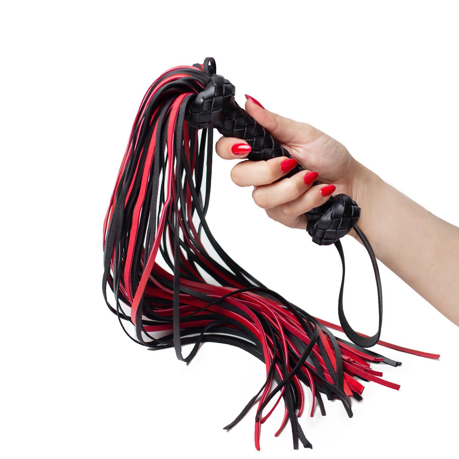 Длинные хвостики выполнены из искусственной кожи. Они плотные на ощупь и идеально подходят для ценителей острых ощущений. Плеть символизирует доминирование над партнером, поэтому в БДСМ играх многохвостая плеть — незаменимый атрибут. Для удобного использования на рукоятке, декорированной плетеными вставками, имеется петля. Длина ручки — 16 см, диаметр — 2,5 см. Длина хвостов — 48 см.