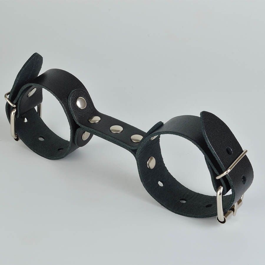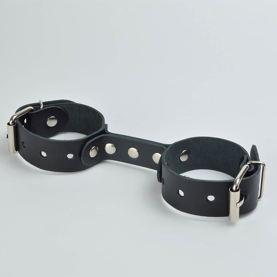 Наручники изготовлены из ременной кожи. Фурнитура никелированная. Наручники имеют кожаную перемычку, на которой зафиксированы наручники. Максимальный охват — 24 см. Ширина ремешков — 2,5 см.