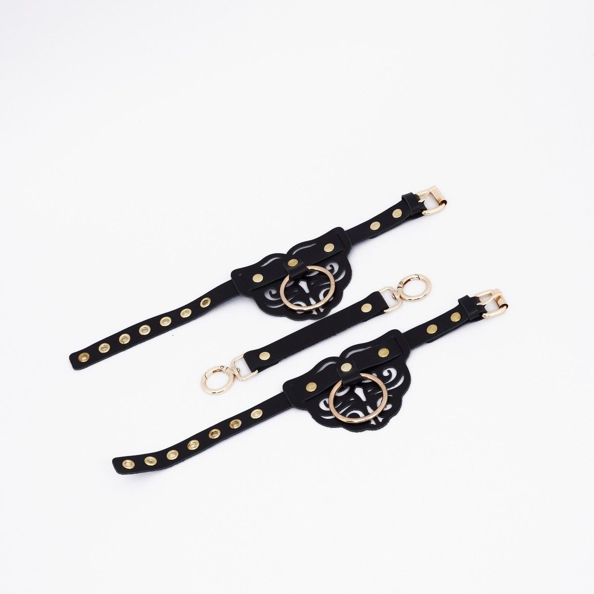 Оковы с декоративными резными узорами изготовлены из натуральной кожи. Декорированы золотой фурнитурой и клепками. В комплект также входит соединительный кожаный элемент с двумя карабинами, с помощью которого можно зафиксировать между собой ноги. Доставляется в фирменной упаковке в виде брендированной деревянной подложки.