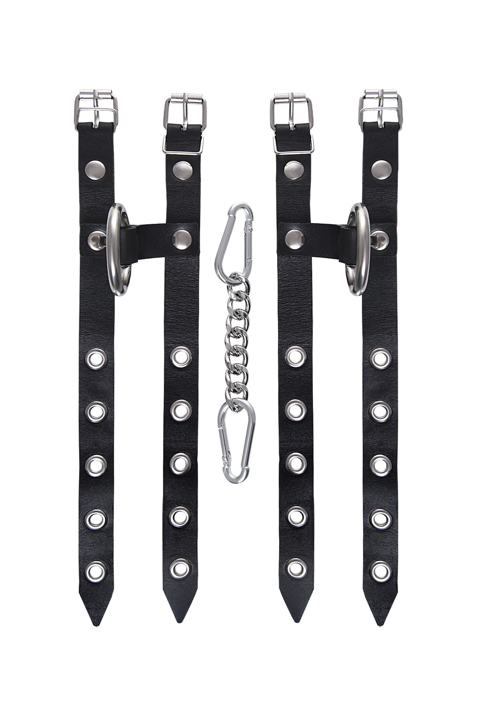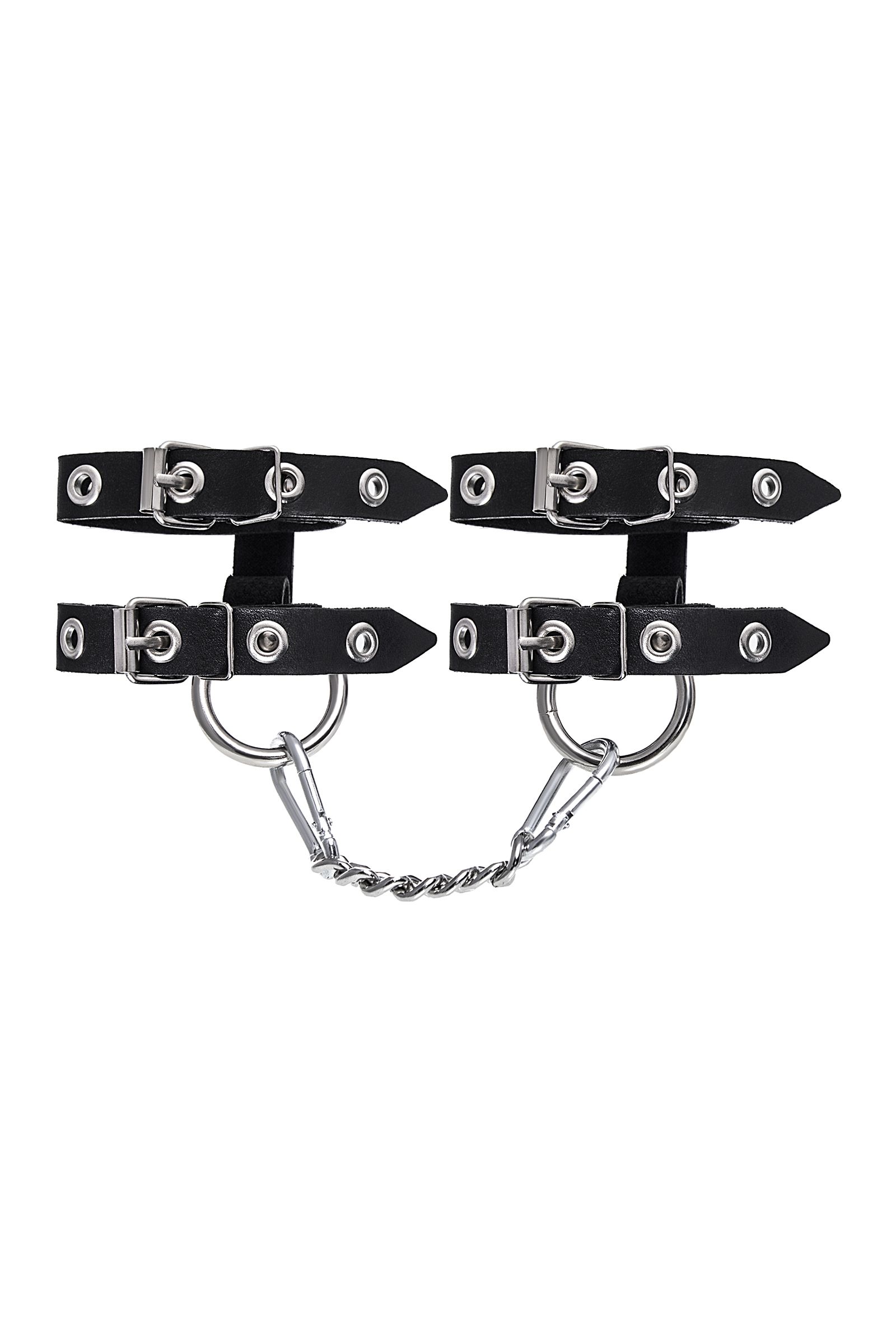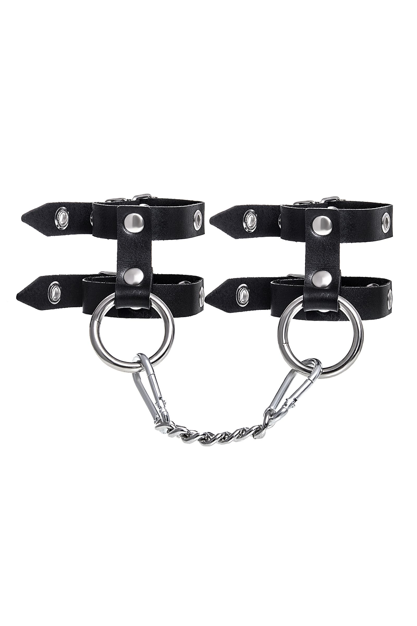 Однослойные кожаные наручники из двух ремешков могут стать стильным аксессуаром на «свободных» руках, но могут послужить вашим целям и фантазиям по своему прямому назначению. Наличие двух колец и карабинов, соединенных между собой металлической цепочкой, позволяет использовать изделие как раздельно – аксессуар-манжеты, так и как наручники для фиксации. К широким металлическим кольцам также можно присоединить и другие аксессуары при помощи карабинов. Благодаря универсальному размеру наручники могут использоваться и мужчинами, и женщинами. Размер легко регулируется с помощью металлических пряжек, органично вписывающихся в общий стиль. Длина манжет — 25 см, ширина ремешков — 1,6 см. Длина сцепки — 13 см.
