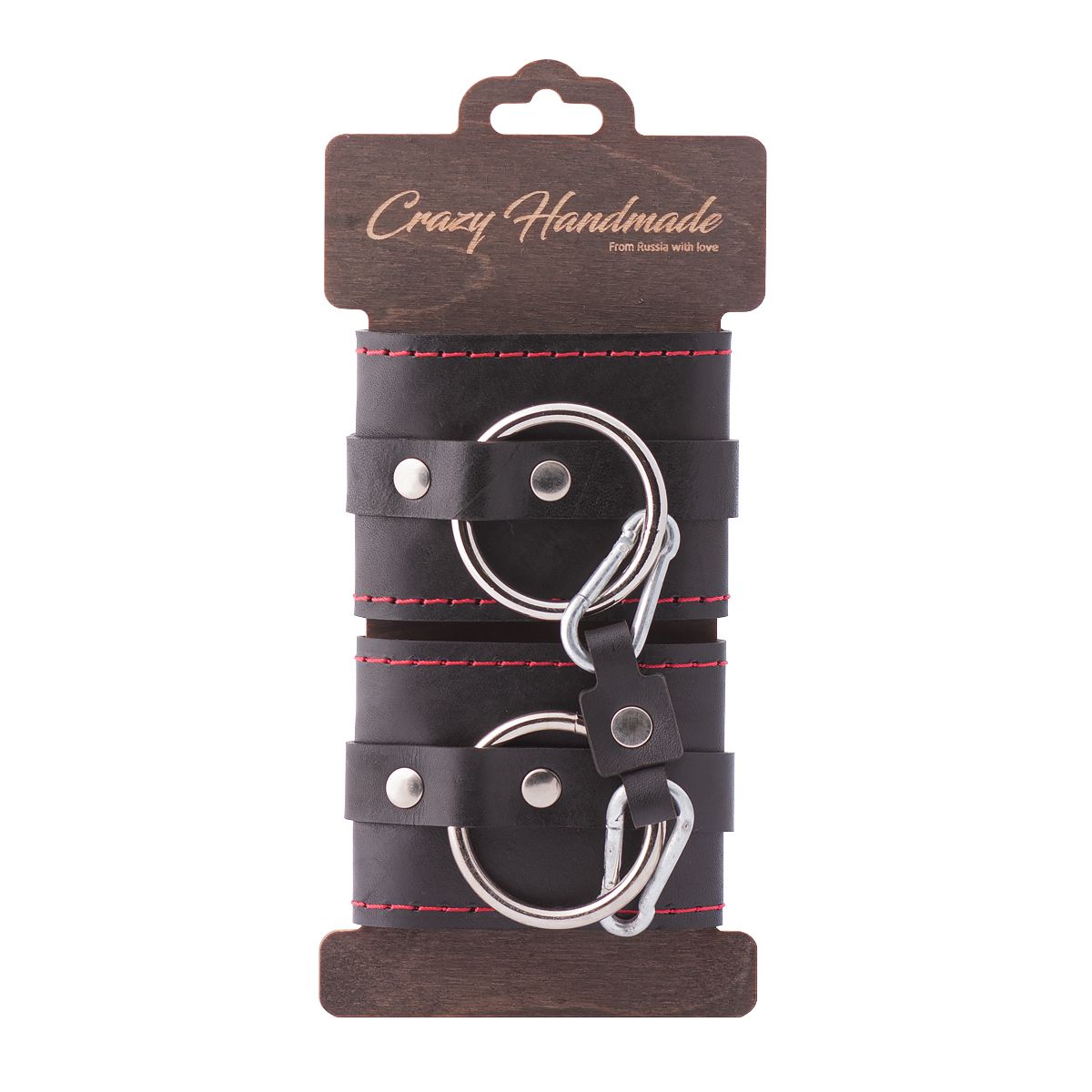 Наручники состоят из одного слоя натуральной кожи, одного ремешка и стального кольца. По краям прошиты декоративной строчкой красного цвета. В комплекте соединительный элемент из кожи с двумя карабинами. Универсальные, подойдут и для использования в любовных играх, и в качестве аксессуара для дополнения образа. Общая длина — 28 см. Длина манжеты — 18,5 см, ширина — 7 см. Обхват — 19-27 см.