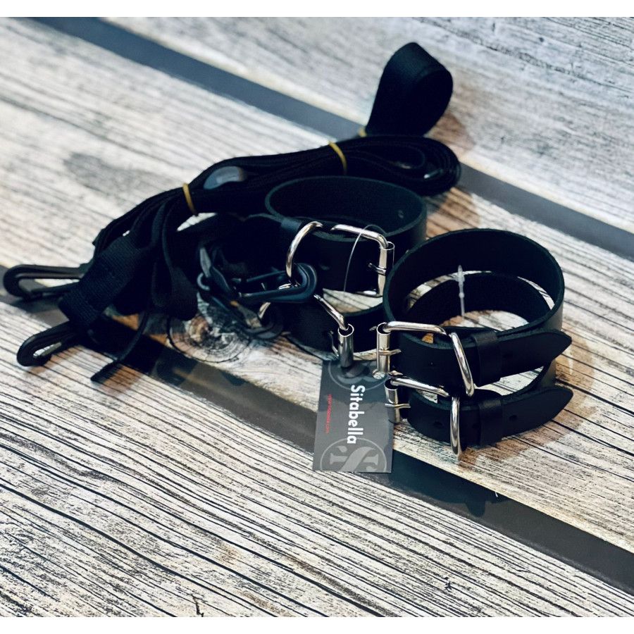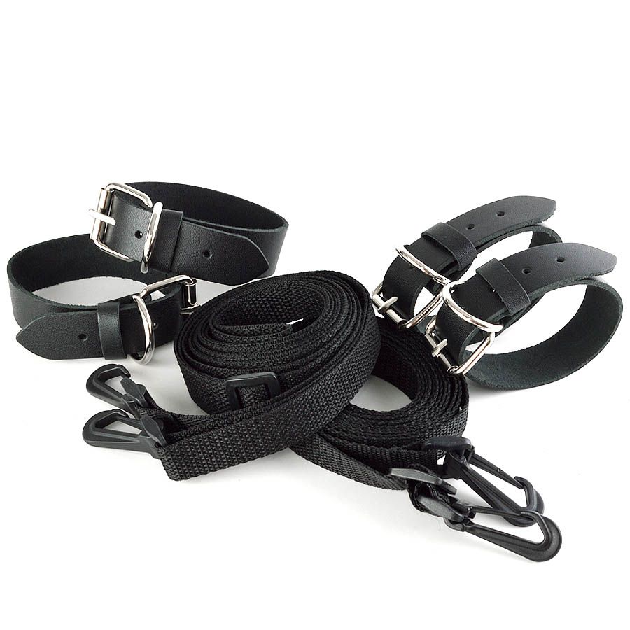 В комплект входят наручники, оковы и две растяжки на кровать. Наручники и оковы крепятся к ремешкам при помощи прочных пластиковых карабинов. Длина каждого ремешка — 2,7 м.