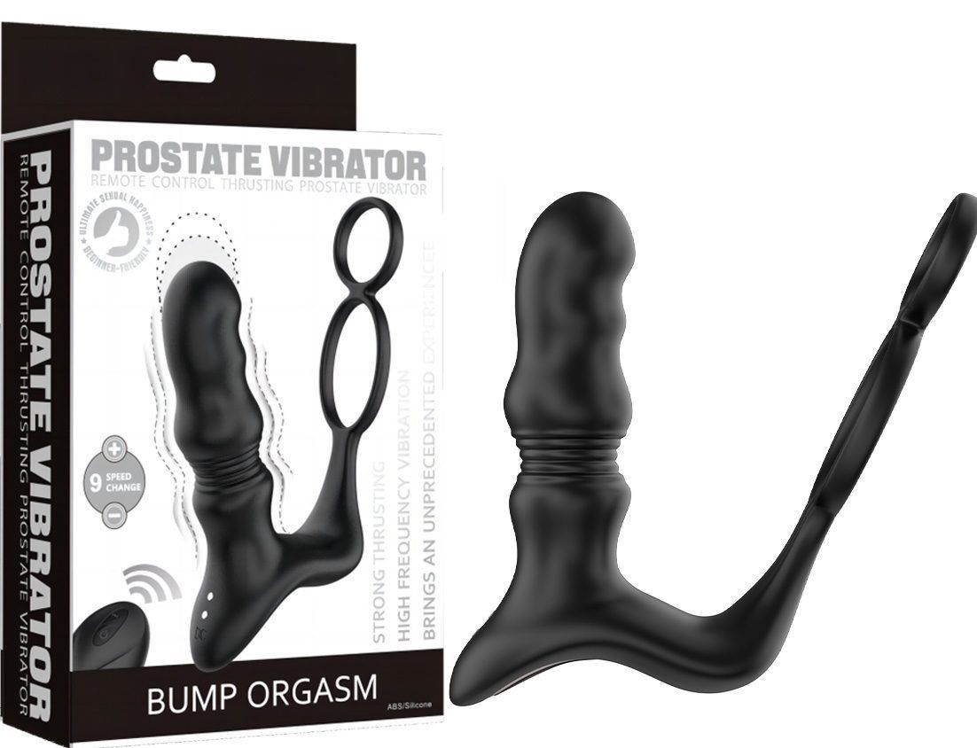 Черный вибростимулятор простаты с поступательными движениями и пультом ДУ. Оснащена 9 скоростями вибрации. Своим строением эта игрушка может одновременно стимулировать несколько зон. Пульт ДУ помогает упросить процесс переключения режимов у игрушки. Рабочая длина — 9 см. Диаметр колец — 3 и 4 см.