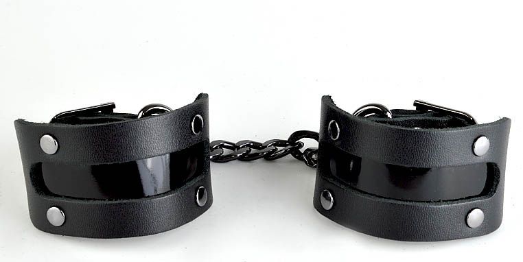 Наручники изготовлены из натуральной кожи и декорированы яркой вставкой из лаковой кожи. Общая длина наручников — 25 см. Ширина манжет — 4 см.