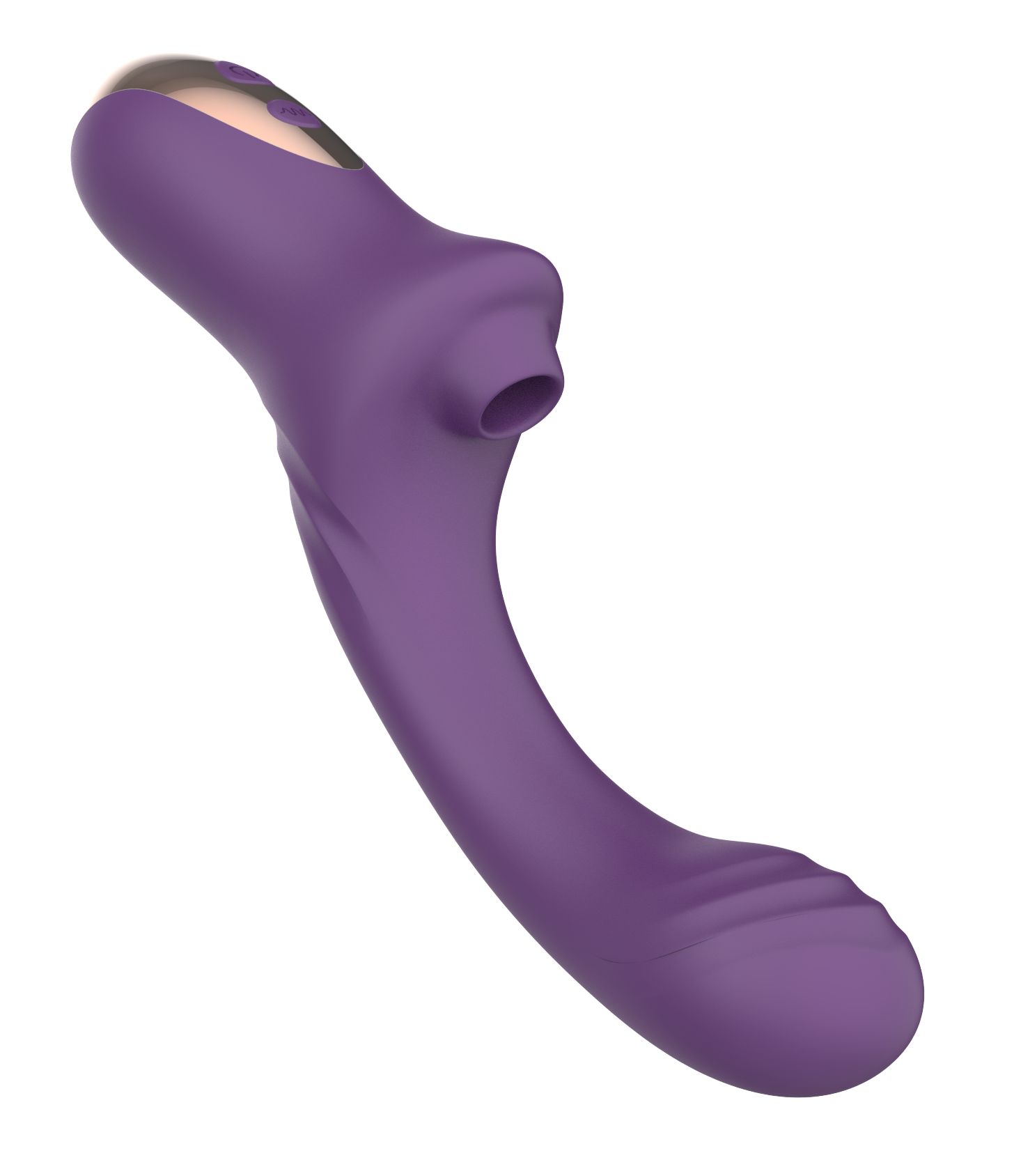 Фиолетовый вагинально-клиторальный вибратор. 10 режимов вибрации и 10 режимов посасывания в клиторальном отростке. Рабочая длина — 15,5 см.