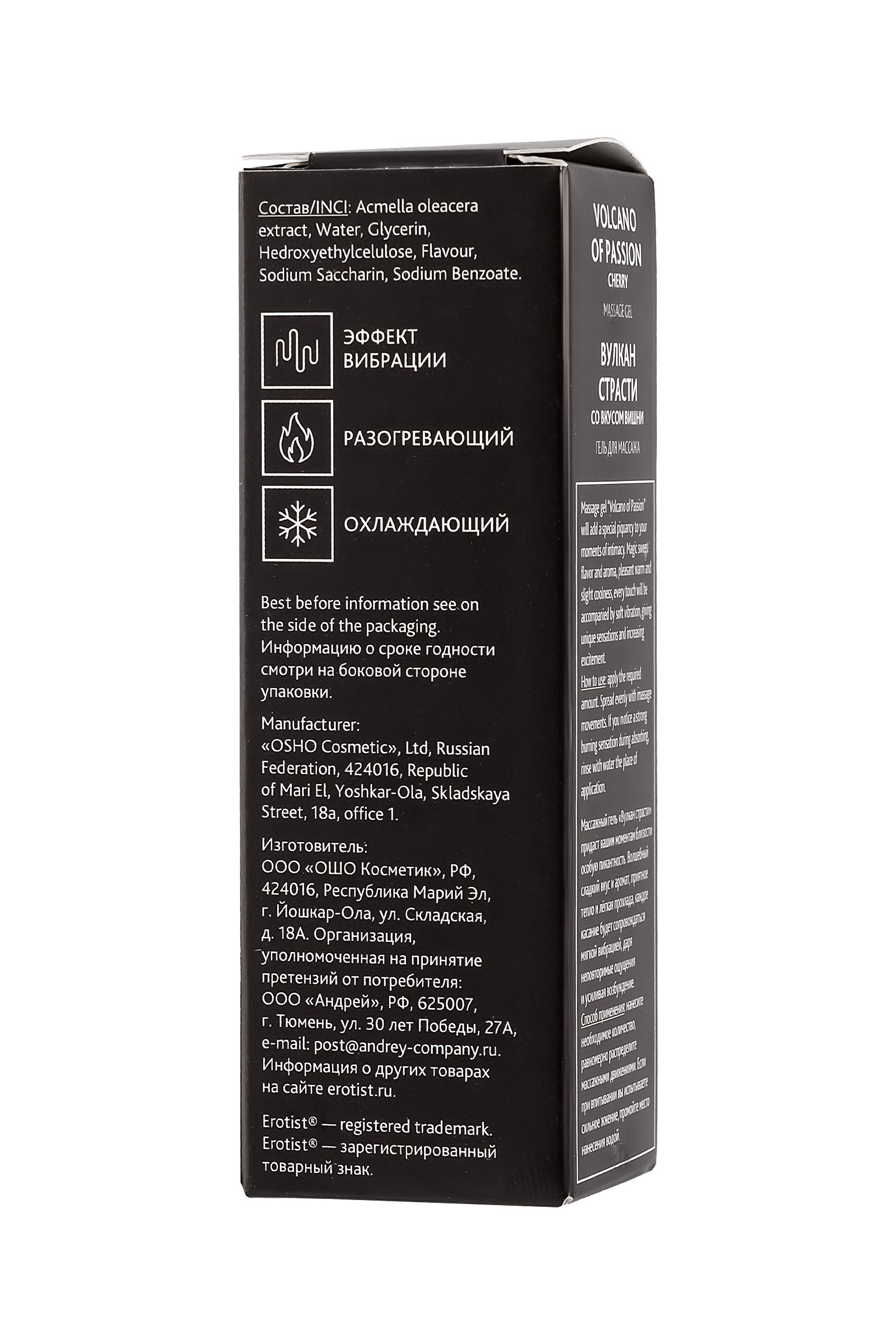 Массажный гель «Вулкан страсти» придаст вашим моментам близости особую пикантность. Волшебный сладкий вкус и аромат, приятное тепло и лёгкая прохлада, каждое касание будет сопровождаться мягкой вибрацией, даря неповторимые ощущения и усиливая возбуждение. Нанесите немного жидкого геля на интимные зоны, и через несколько секунд вы почувствуете тепло, затем в течение 2-3 минут легкую вибрацию и легкий холодок. Длительность эффекта зависит от особенностей вашего организма. Гель с вибрирующим эффектом для интимных зон на основе натуральных ингредиентов, без парабенов. Вкус и аромат вишни. Подходит для поцелуев и орального секса.