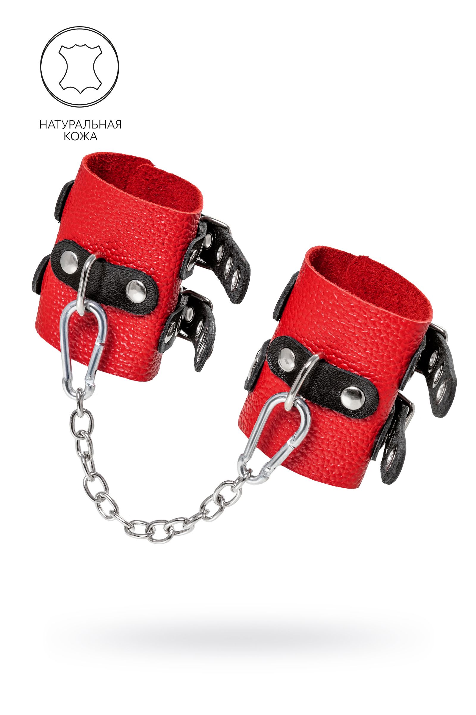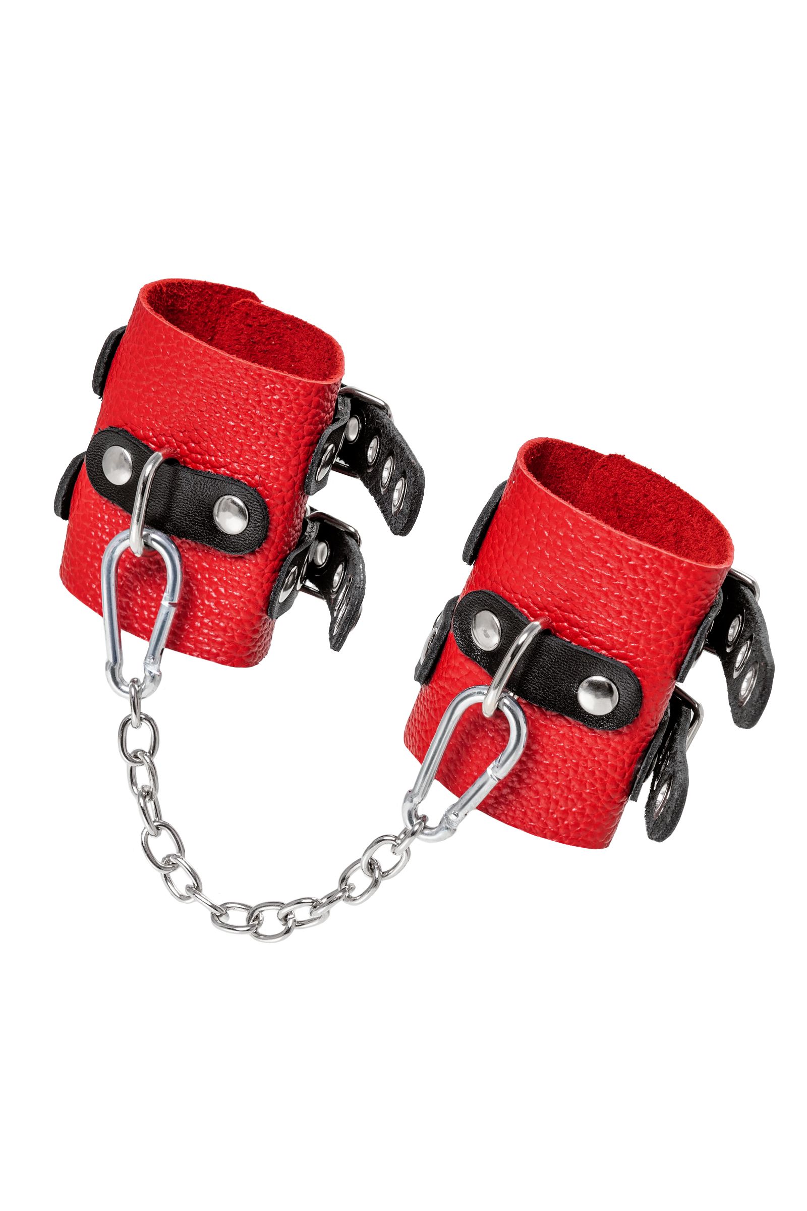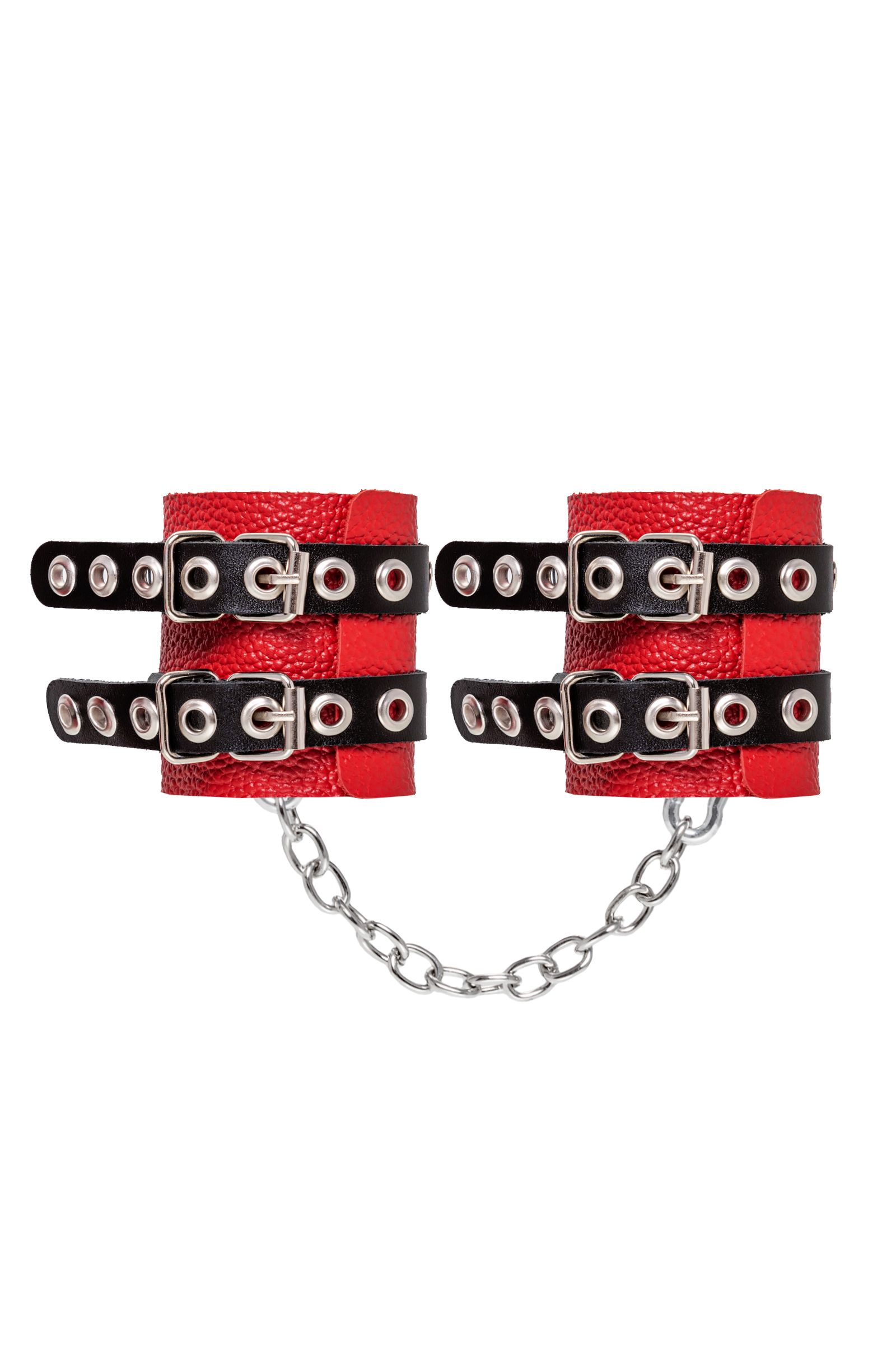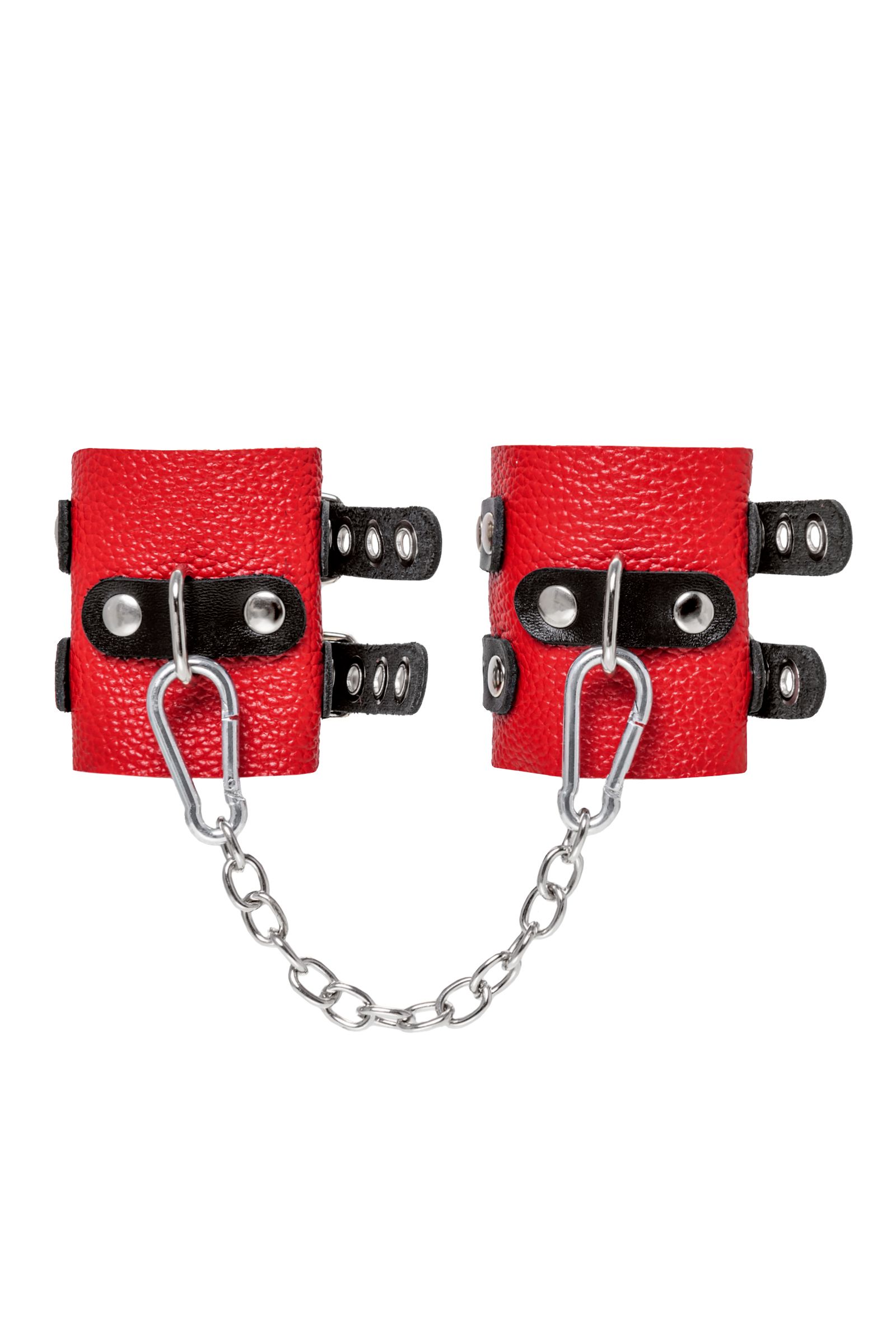 Не бойтесь своих желаний! Основатели бренда уверены: лучший способ избавиться от искушения — поддаться ему! Мягкие, красные, кожаные наручники с двумя чёрными, жёсткими ремнями могут стать стильным аксессуаром, а могут послужить вашим целям по своему прямому назначению. Частичное обездвиживание и невозможность двигать руками дают вам полную власть над партнером – взрослые игры для взрослых. Наличие двух колец и карабинов, соединенных между собой металлической цепочкой, позволяет использовать изделие как раздельно – аксессуар-манжеты, так и как наручники для фиксации. К широким металлическим кольцам также можно присоединить и другие аксессуары при помощи карабинов. Благодаря универсальному размеру наручники могут использоваться и мужчинами, и женщинами. Длина манжет — 18 см, ширина — 7 см.