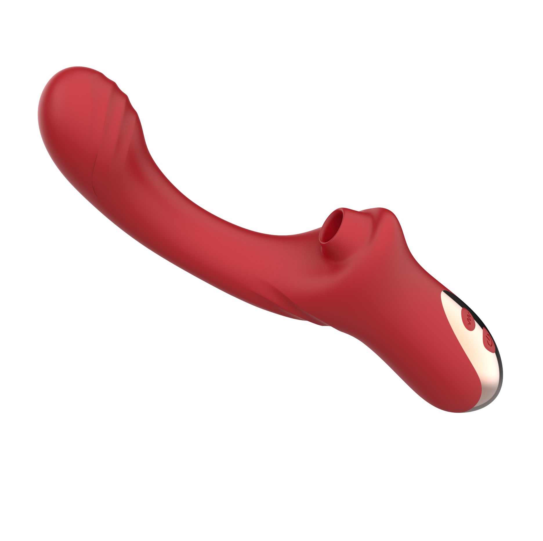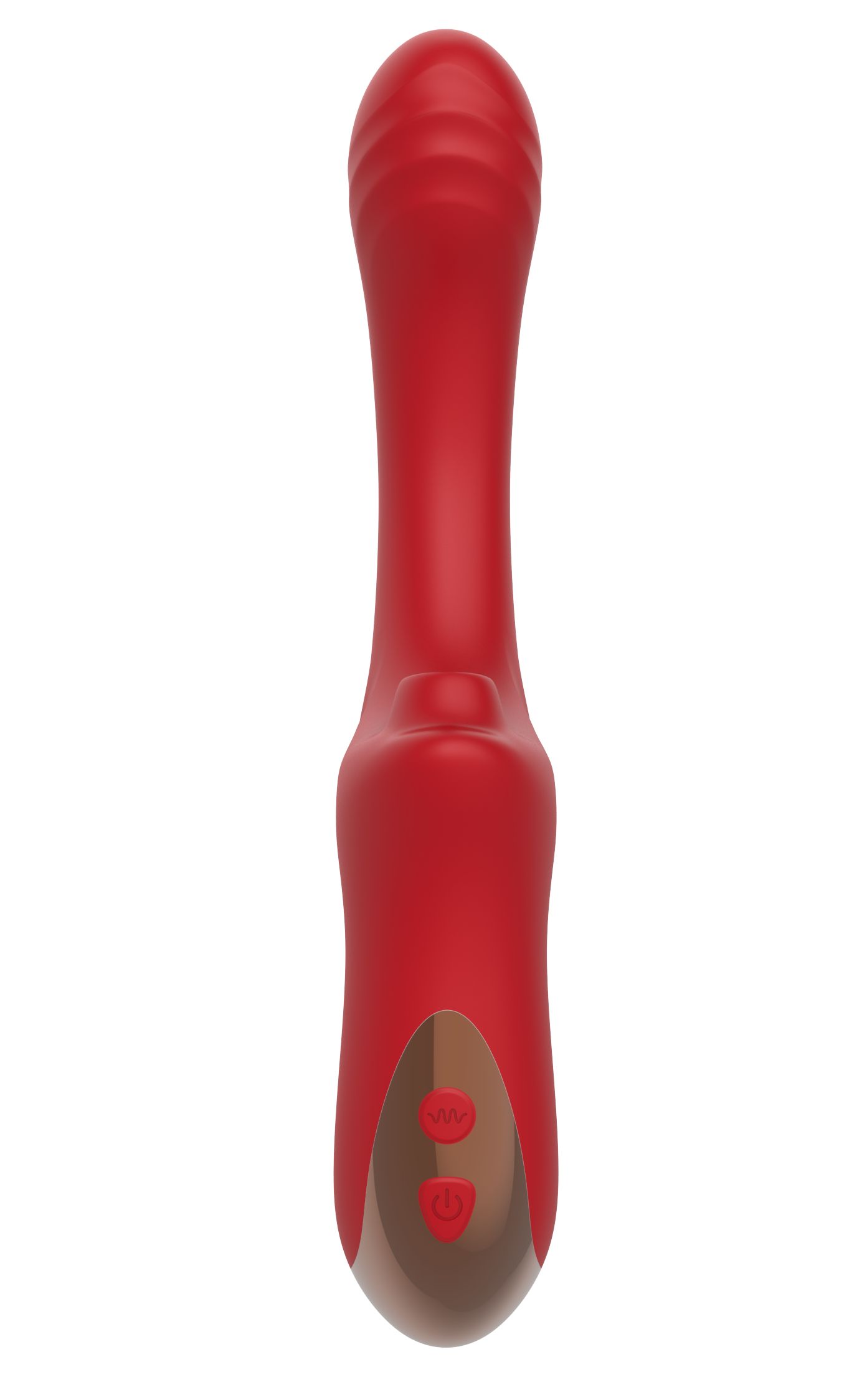 Красный вагинально-клиторальный вибратор. 10 режимов вибрации и 10 режимов посасывания в клиторальном отростке. Рабочая длина — 15,5 см.
