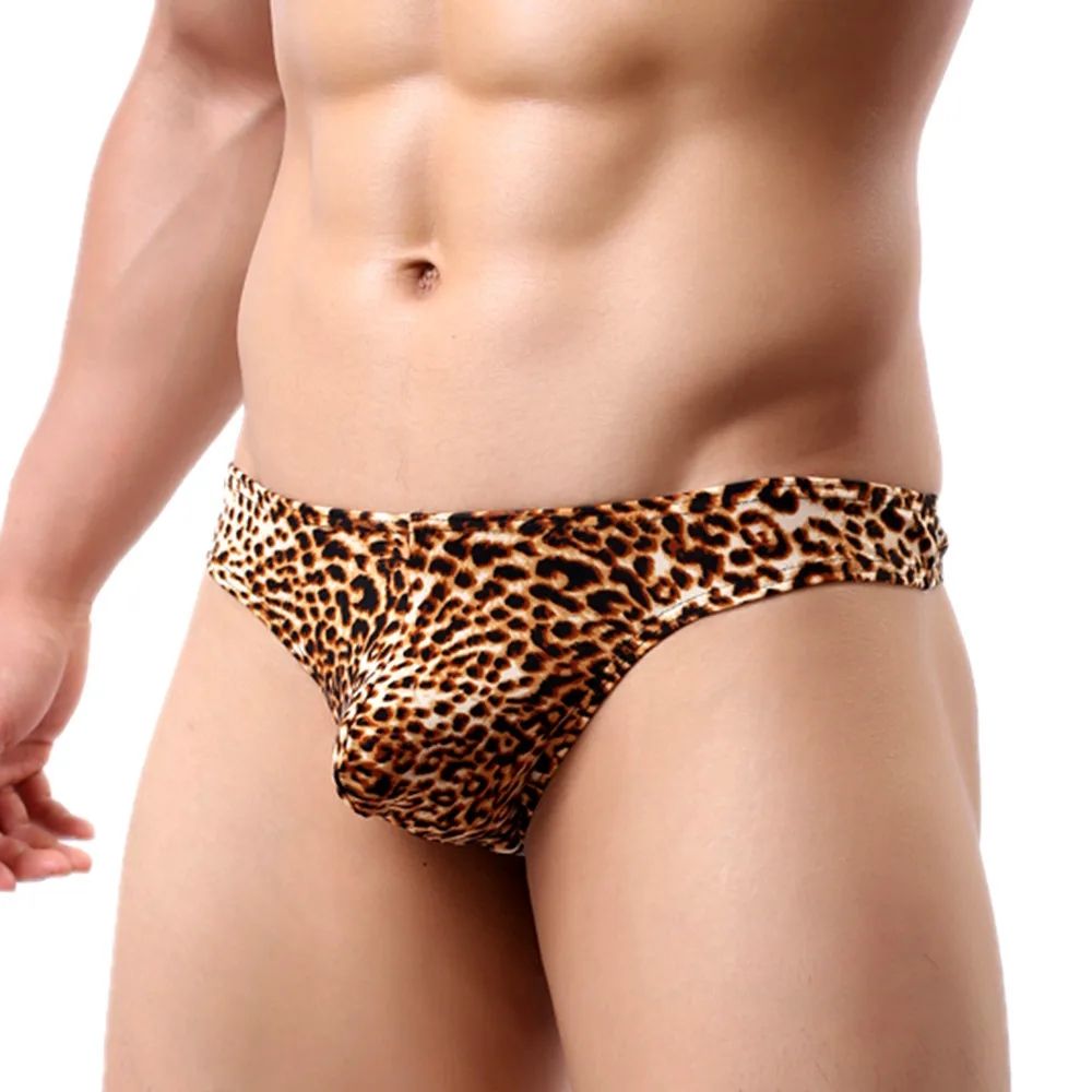Леопардовые трусы-тонги. Шов спереди и специальный крой для того, чтобы не прижимать пенис плотно к телу.