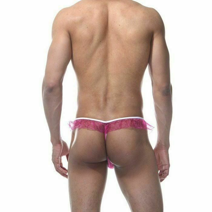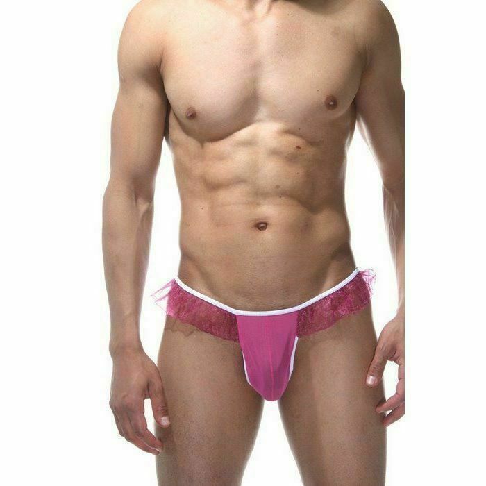 Мужские розовые трусы-тонги с оборками.