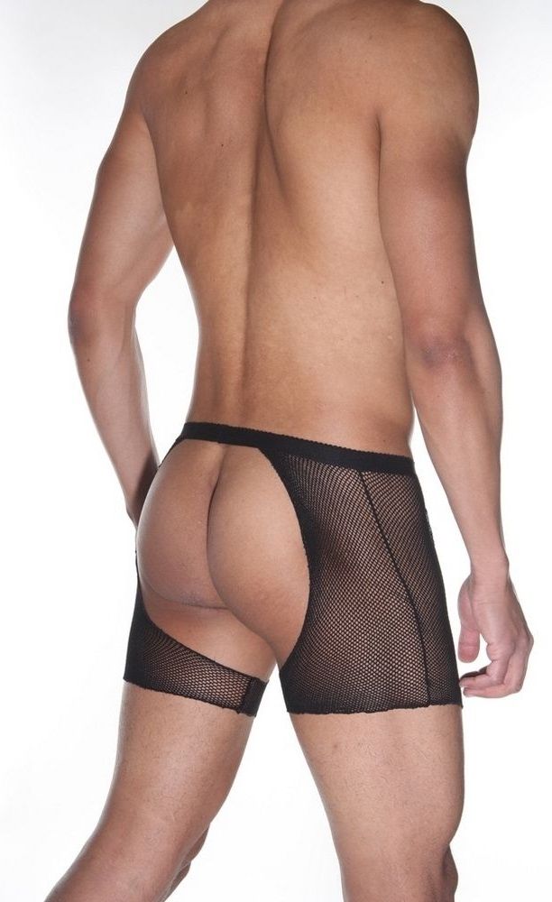 Черного цвета джоки, оригинального пошива. Трусы сшиты из двух видов материалов — мелкой сетки и черного тянущегося гладкого материала на гульфике в мелкую поперечную полоску. Ягодицы полностью открыты. Пояс неширокий, хорошо тянущийся.