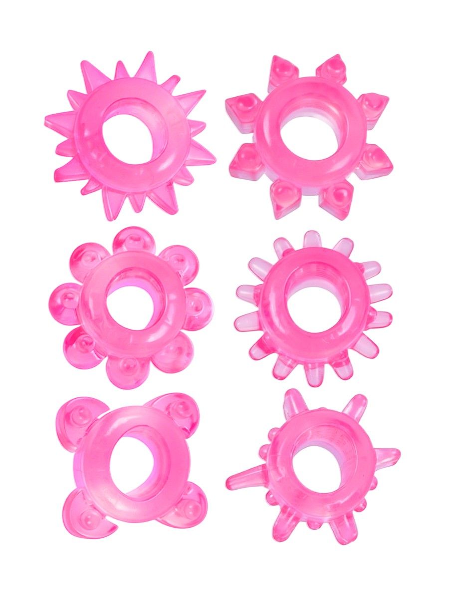 Эрекционное кольцо обеспечит продолжительную эрекцию и поможет продлить интимную близость. «Отростки» на внешней поверхности секс-игрушки будут стимулировать интимные зоны партнёрши. Эрекционное кольцо хорошо тянется. Изготовлено из приятного на ощупь материала. В наборе 6 колец с различным рельефом.