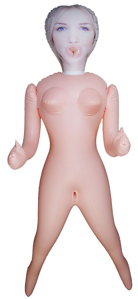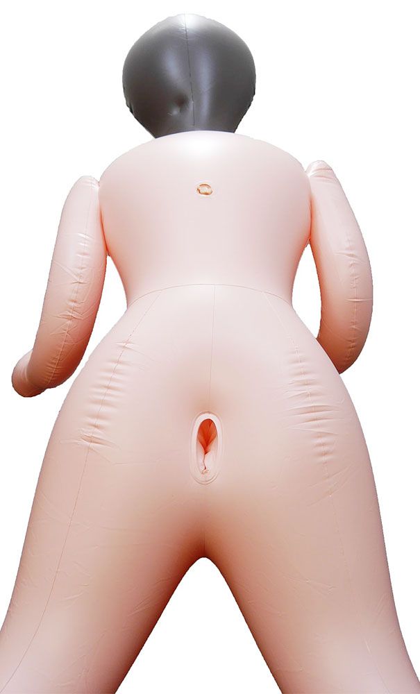 Красивая надувная кукла любви с очаровательным напечатанным лицом и стоячим положением. Она натурального размера, имеет грудь и 3 заманчивые любовные дырочки.