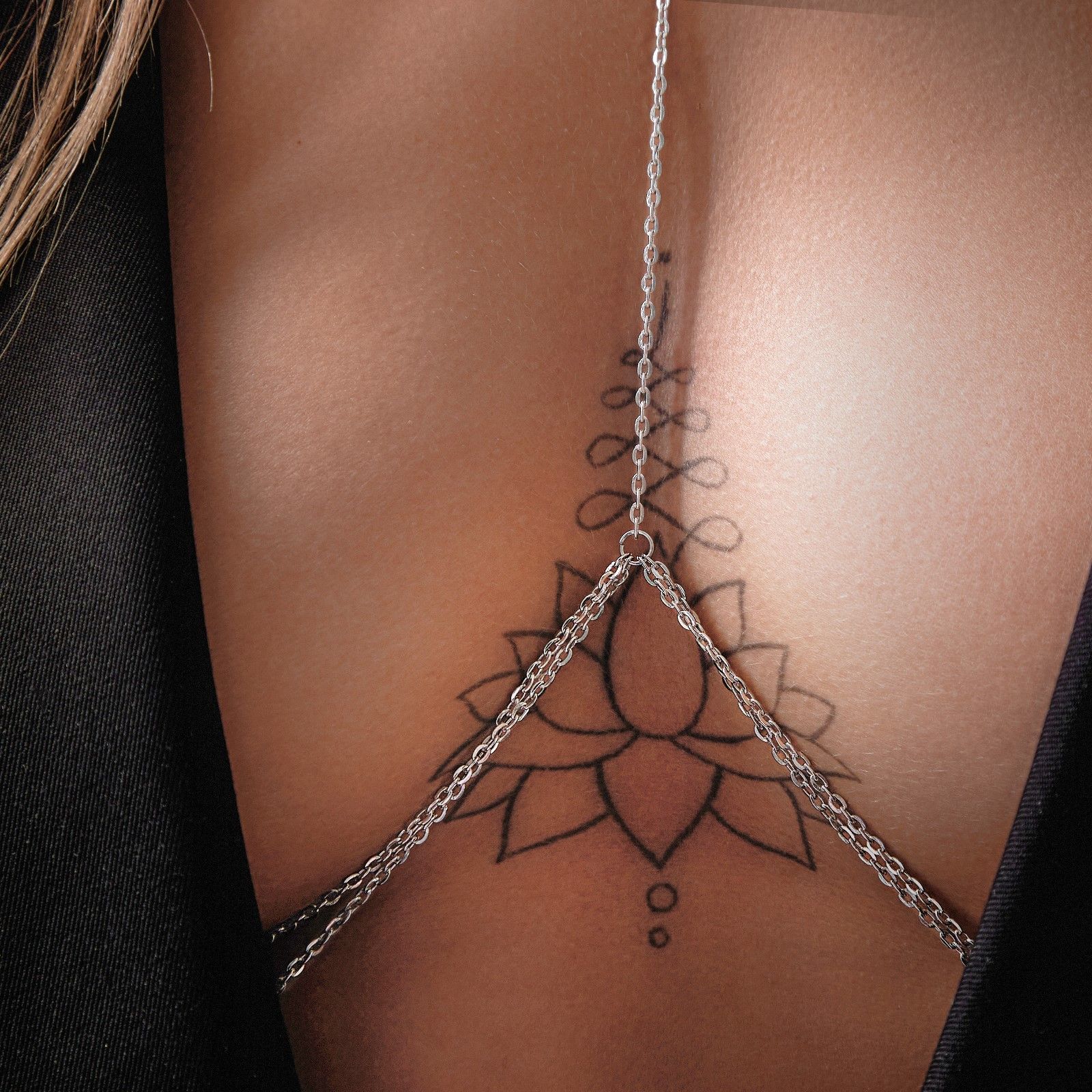 Оригинальная цепочка на грудь выполнена из тонкого металла в виде тоненьких колечек и соединена таким образом, чтобы подчеркнуть зону декольте.