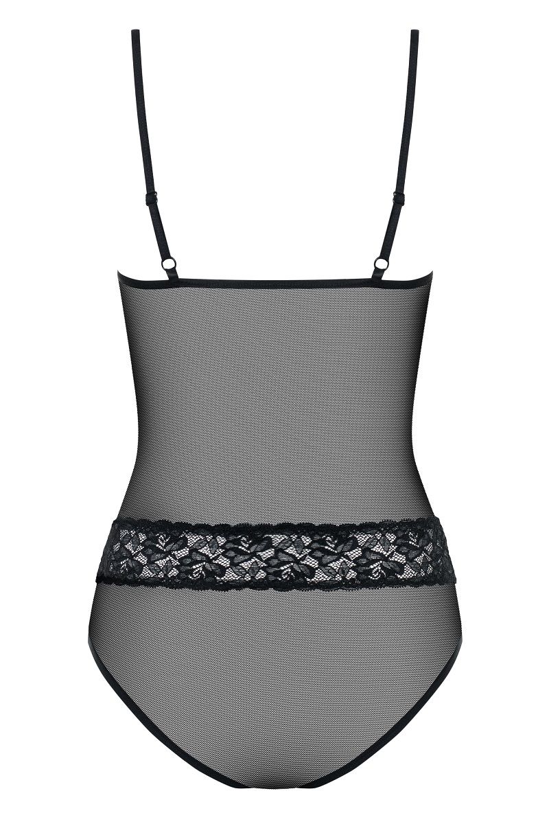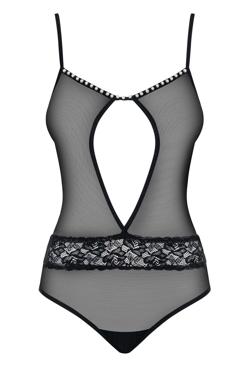 Полупрозрачное элегантное боди, зона декольте украшена жемчужинками, низ боди на застежке.