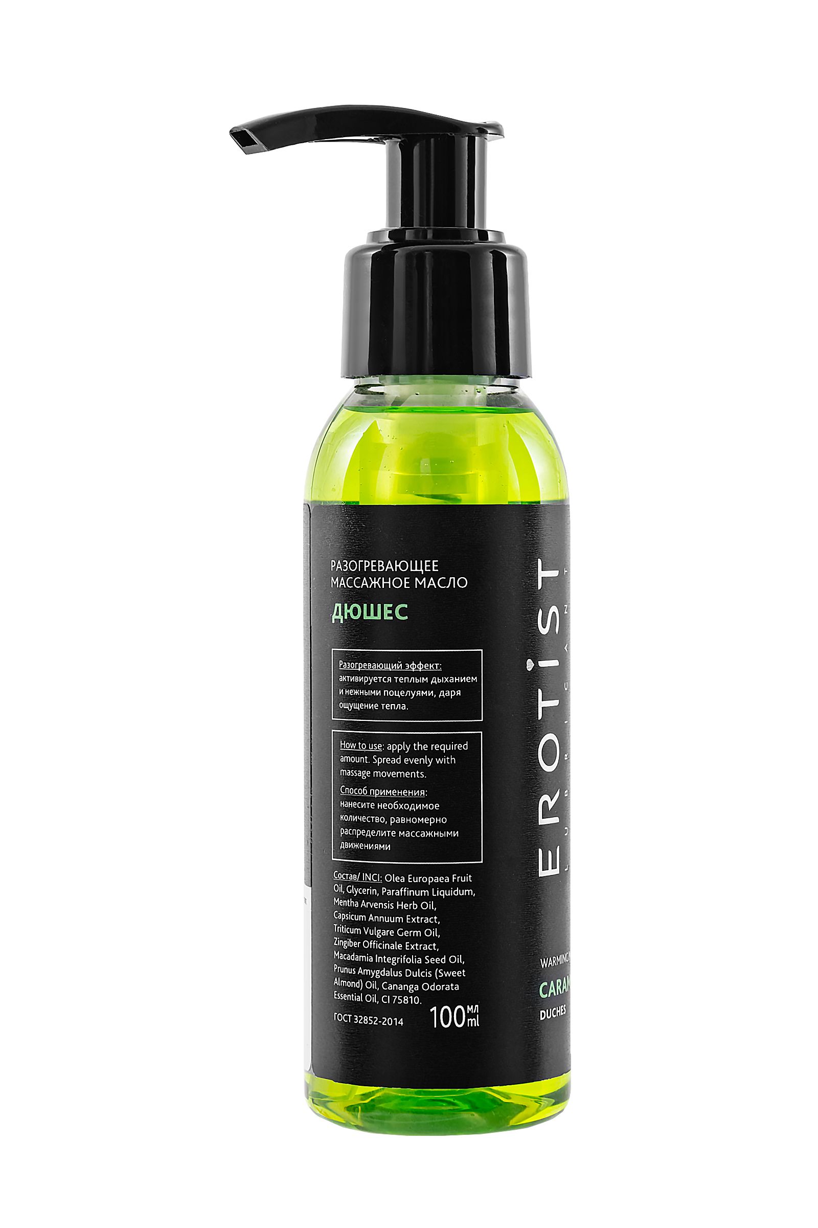 Разогревающее масло со вкусом «Дюшес» из линейки Erotist Caramel Club сочетает в себе сладкий, узнаваемый аромат любимого лимонада и мягкое тепло прикосновений. Масло создано для того, чтобы превратить обычный массаж в атмосферный ритуал — аромат груши создаёт романтическое настроение, а разогревающий эффект, который активируется дыханием, усиливает чувственность. Формула на основе масел оливы, сладкого миндаля, макадамии и зародышей пшеницы глубоко питает и увлажняет кожу, делая её гладкой и шелковистой. Экстракты имбиря и стручкового перца активируют лёгкое согревающее действие, усиливая чувствительность. Масло мяты и иланг-иланга дополняют композицию, тонизируя и создавая расслабляющий ароматический фон.