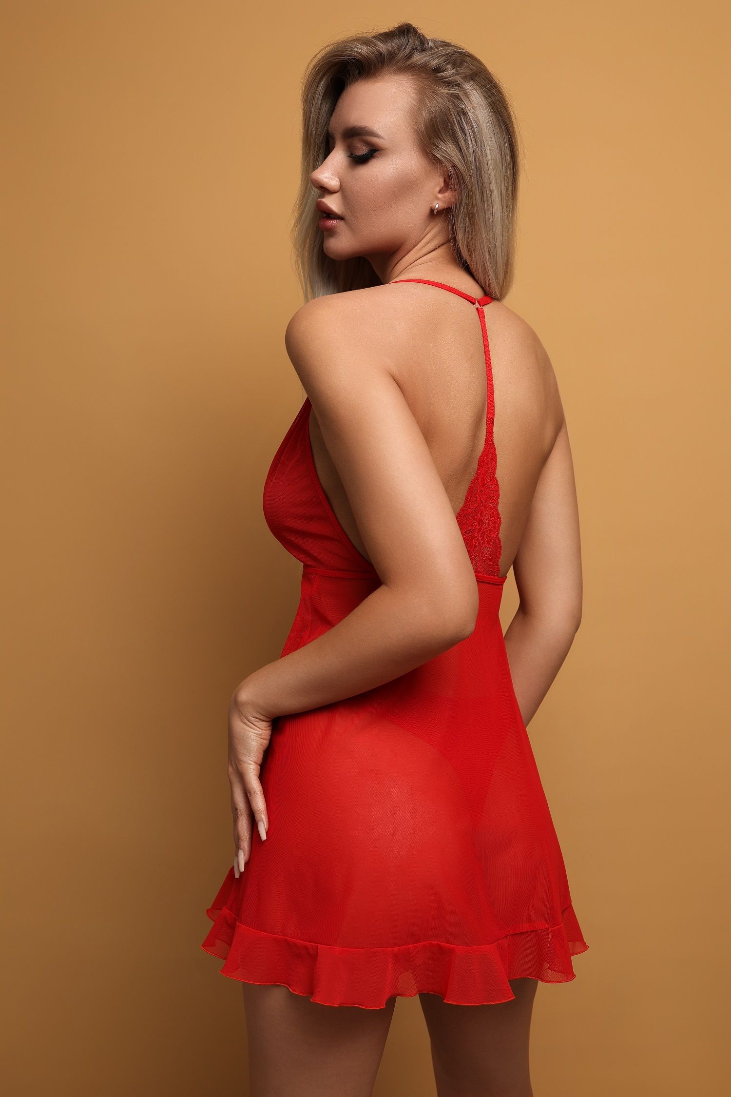 Этот беби-долл на запах — настоящее искушение для глаз. Основной материал — прозрачная сетка — дает возможность любоваться телом. Изящные рюши на нижней кромке, а также кружево на лифе добавляют изысканности. Разрезы добавляют игривости. Такая сорочка подойдет для любой фигуры. В ней вы будете чувствовать себя комфортно и привлекательно одновременно. Открытая спинка этой сорочки изящно обнажает область лопаток. В комплекте: сорочка, трусики-стринги.