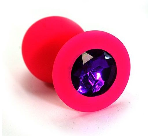 Розовая силиконовая анальная пробка с темно-фиолетовым кристаллом — 7 см.