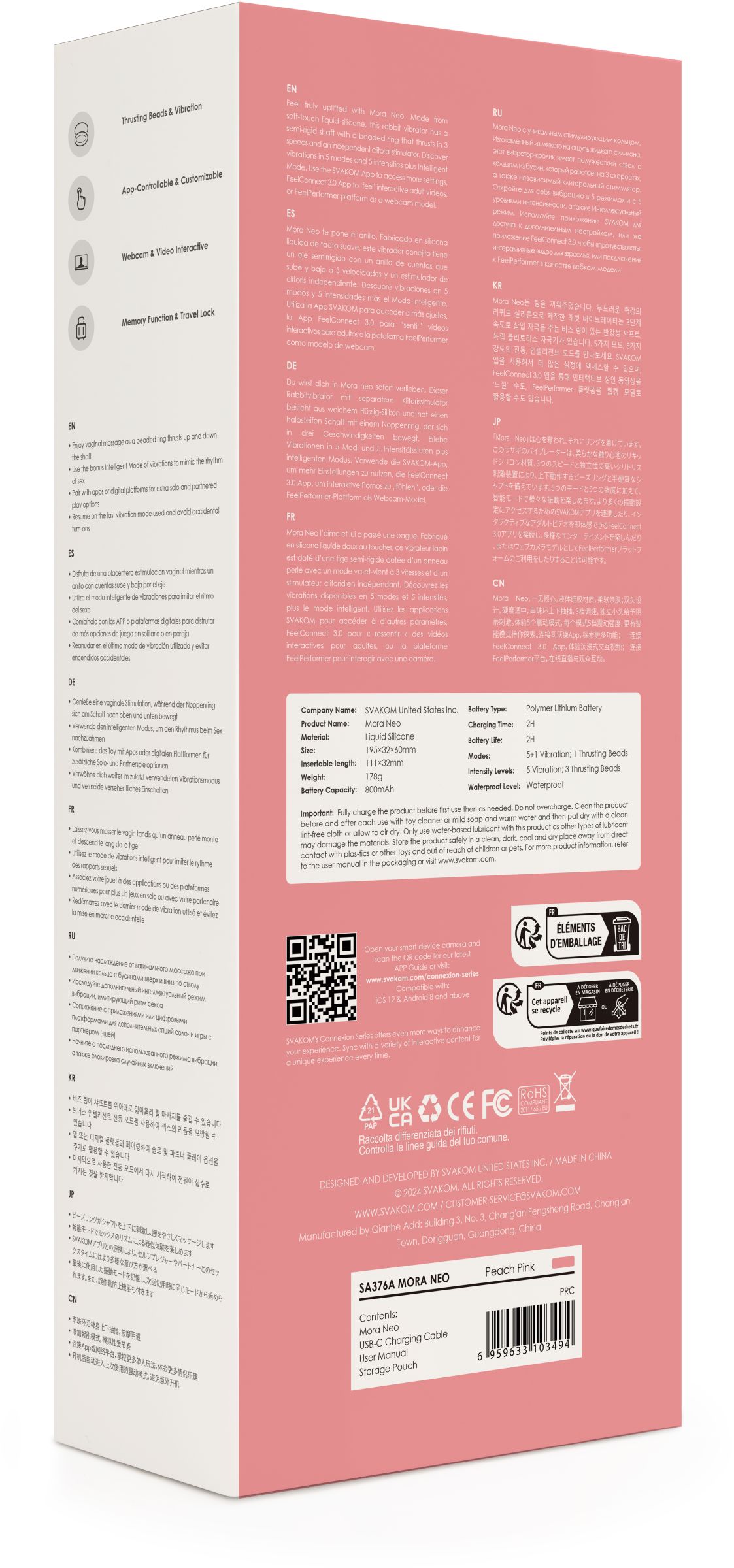 Изготовленный из мягкого на ощупь жидкого силикона, Mora Neo оснащен кольцом с бусинами, которое встроено в его полужесткий стержень, а также независимым стимулятором клитора. Проявите творческий подход, подключив Mora Neo к смартфону с поддержкой Bluetooth, а затем используйте приложение SVAKOM для настройки параметров или наслаждайтесь длительным управлением игрушкой или взаимодействием с партнером. В подвижное кольцо заложено 3 скорости движения шариков Mora Neo, а в стволе и клиторальном отростке также 5 режимов и 5 уровней интенсивности вибрации. Затем попробуйте бонусный интеллектуальный режим вибраций, имитирующий сексуальные ритмы. Mora Neo снабжена функцией памяти, которая возобновляет работу с последним использованным режимом вибрации, а также блокировкой кнопок для предотвращения случайных включений. Индикатор заряда батареи напомнит вам о необходимости подзарядки через USB-порт, имеющий пылезащитную крышку. Водонепроницаемая конструкция позволяет легко чистить и использовать ее в ванне или душе. Рабочая длина — 11 см.