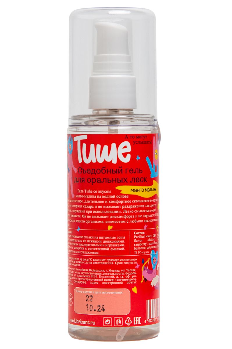 Гель Tishe с ароматом манго и малины на водной основе обеспечивает чувственное, длительное и комфортное скольжение во время близости. Он не содержит сахара и не вызывает раздражения или других дискомфортных ощущений при использовании. Легко смывается водой и не оставляет липкости. Он не вызывает дискомфорта и не нарушает pH-баланс естественной среды вашего организма. Этот гель совместим с изделиями из латекса и игрушками, он позволяет не ограничиваться в выборе интимных аксессуаров. Ощути настоящую свободу вместе с Tishe!