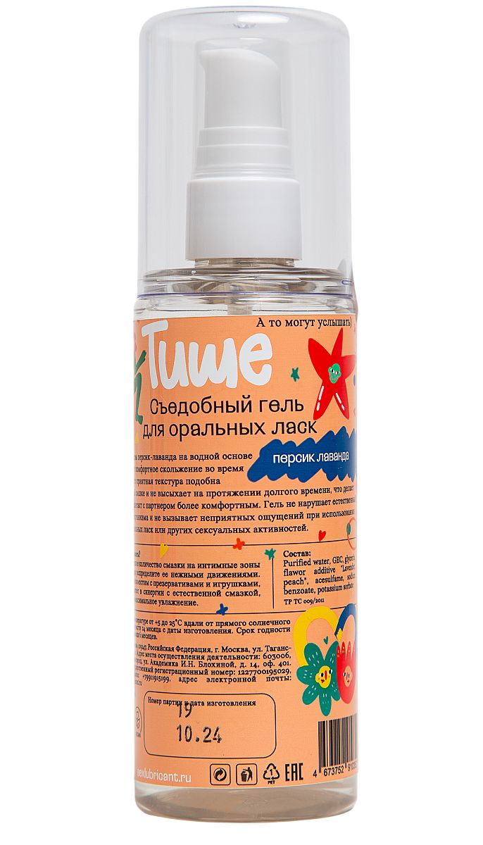 Tishe с ароматом персика и лаванды на водной основе обеспечивает чувственное, длительное и комфортное скольжение во время близости. Его приятная текстура подобна натуральной смазке и не высыхает на протяжении долгого времени, что делает интимный контакт с партнером более комфортным. Гель не нарушает естественный pH-баланс организма и не вызывает неприятных ощущений при использовании во время оральных ласк или других сексуальных активностей.