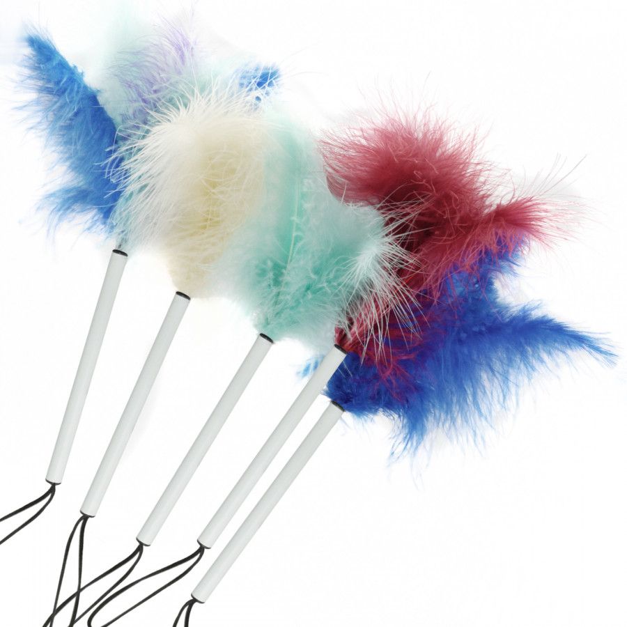 Щекоталка состоит из металлической рукояти и ярких цветных перышек. Длина ручки — 14 см.