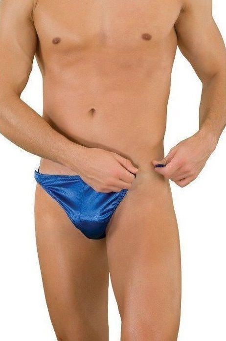 Синие трусы-тонги с застежкой сбоку и сатиновым блеском.