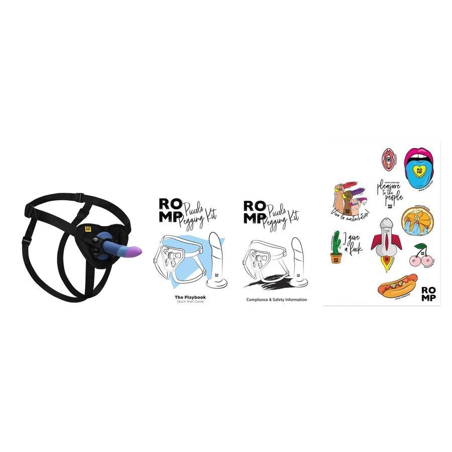 Набор Piccolo Pegging Kit состоит из фаллоимитатора и регулируемого ремня для страпона. Фаллоимитатор Romp Piccolo изготовлен из мягкого шелковистого силикона и имеет изогнутую форму, которая идеально подходит для стимуляции точки G или точки P. Он подойдёт как начинающим, так и опытным любителям интимных развлечений. У Romp Piccolo широкое основание с присоской, благодаря которой его можно закрепить на любой гладкой и ровной поверхности. Это позволит наслаждаться удовольствием без помощи рук и экспериментировать с разными позами и ракурсами. Фаллоимитатор легко вставляется в предназначенное для него отверстие на поясе для страпона и надёжно закрепляется кольцом. Ремни пояса оснащены регуляторами, которые позволяют подогнать крепление под нужный размер. Систему для страпона можно стирать в машине.