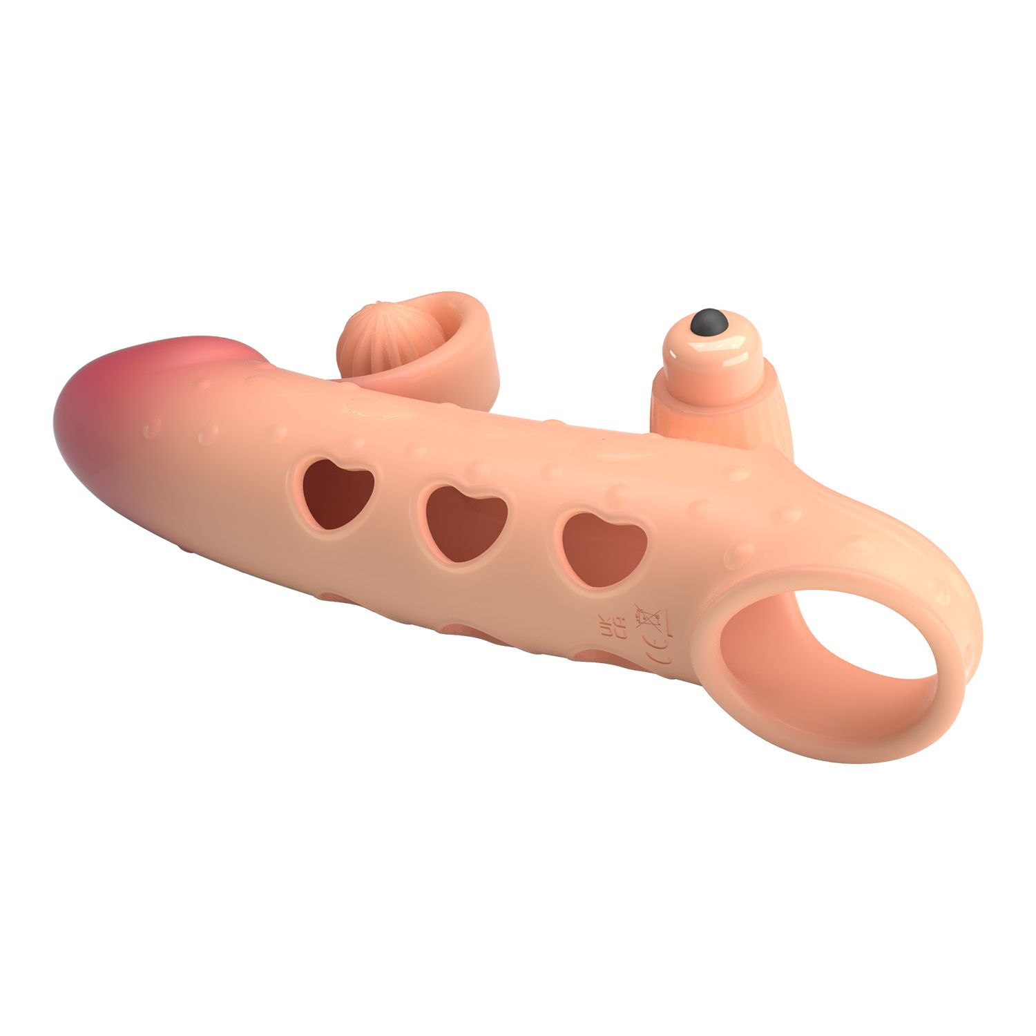 Телесная вибронасадка на пенис с подхватом мошонки. Насадка удлиняет член, добавляет ему толщины. Обеспечивает партнёрше массаж клитора при глубоких проникновениях.