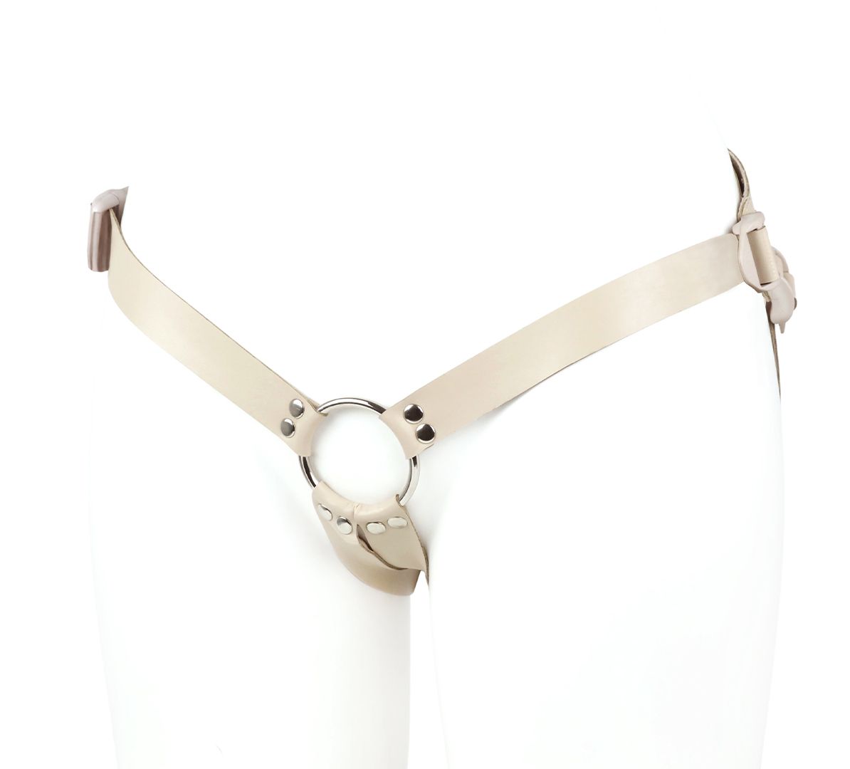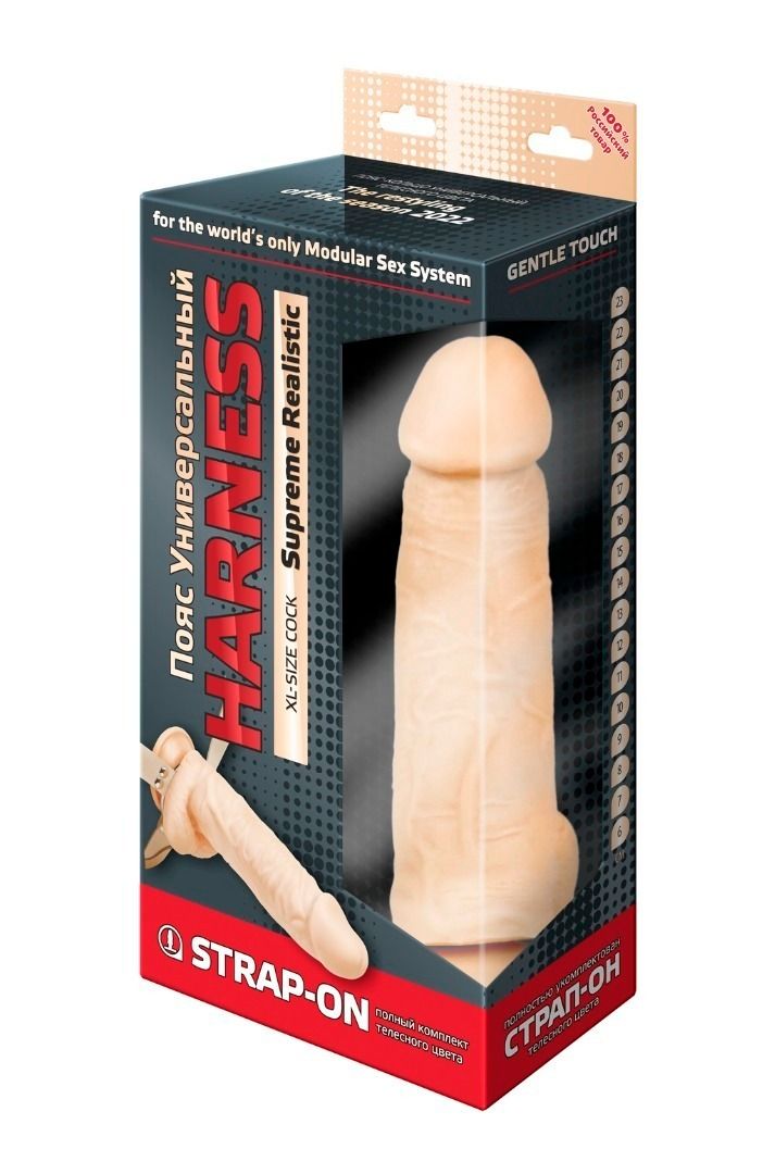 Пояс–кольцо: универсальный для реалистиков с присоской и плагов. Cнабжена кожаным бандажным поясом на бархатном основе и фастексами-быстросьемами. Модель подходит как мужчинам, так и женщинам. Регулируется по форме тела всего один раз. Дальше просто расстегивается с помощью пряжек-фастексов и надевается в следующий раз, как готовое лекало. Металлическое кольцо в конструкции харнесса позволяет использовать любые фаллоимитаторы с присоской. В данной комплектации пояс и насадка прилагаются в телесной цветовой гамме. Такой комплект предлагается для пар, которым важна естественность и максимальная схожесть с обычным интимным контактом. Размер пояса — 40-64. Рабочая длина — 15 см. Диаметр головки — 3,8 см.