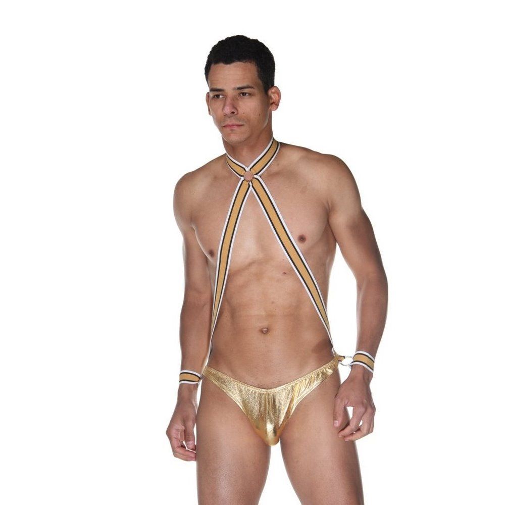 Боди для мужчин из красивой золотой блестящей ткани. Широкие резиновые ремешки переплетаются на шее, соединяются с трусами и двумя манжетами на руках, при помощи металлических колец.